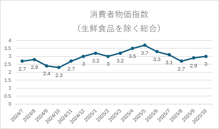 2025年時点で、全国消費者物価指数(CPI)は前年同月比約3%上昇。