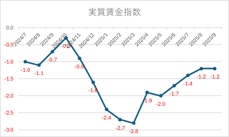 しかし、インフレ率に届いていないため実質賃金は低下。